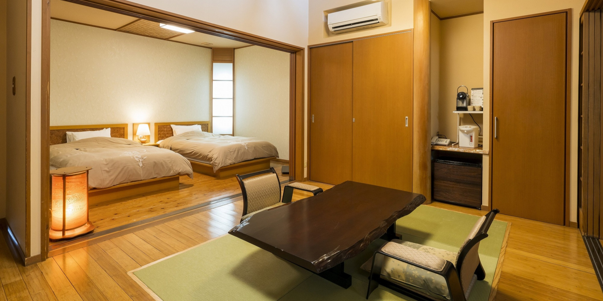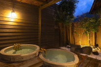 すべての客室に、半露天風呂を備えた二間続きの和洋室をご用意。