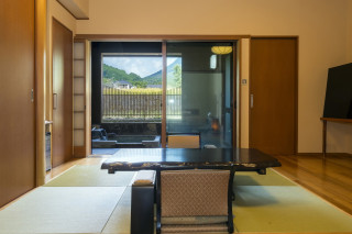 客室は全て半露天風呂付き、2間の和洋室です。自然を常に感じる開放感ある空間で、身も心も癒される時間をお過ごしいただけます。