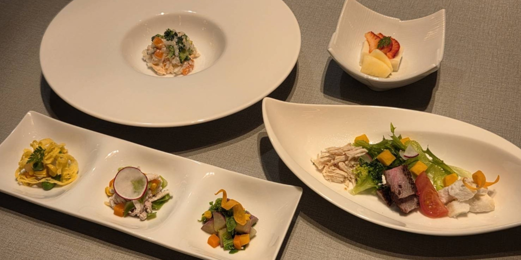 和食に大切な「五味」「五色」「五法」、そして「五適」「五覚」季節や食材、調理法、見た目の美しさや、お客様の人数や好み、おもてなしの心と感謝の気持ち、常に「一座建立」を胸に置き全てをバランスよく折り重ね、美しさを演出できるような日本料理を目指します。