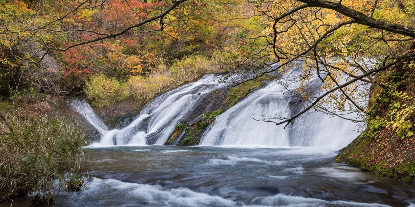 花巻温泉を流れる台川にある滝。高さ8.5m、幅30mにもおよぶ大きな岩の上を、水が幾筋にもわかれ滝壺に落ちています。 釜淵の滝周辺の森林は遊歩道になっており、木漏れ日のなかを歩ける手ごろな散策コースです。