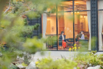 優雅な洋館のようなラウンジでは、天井に至る大きな窓から四季の草木が茂る中庭を見渡せます。