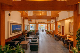 開放的な吹き抜けと、天井の太い木材の梁が印象的なエントランスとラウンジスペース。