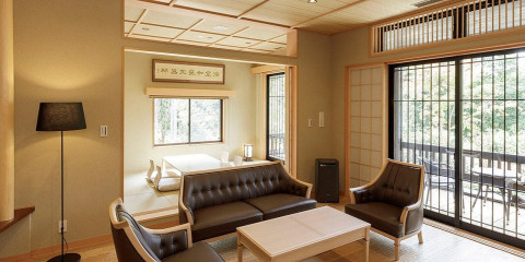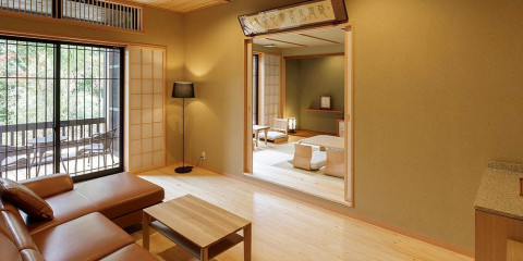 離れ特別室のリビングルーム。あめ色の色調と土壁の自然な色合いで落ち着きのある特別室は、中庭を見渡せるバルコニーや桶型檜風呂(半露天風呂)など特別な時間をお過ごしいただけます。