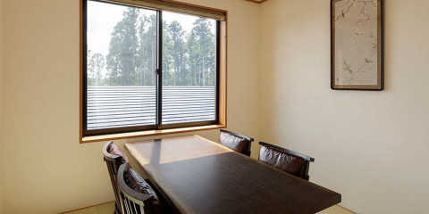 離れ特別室の和室です。大きく配した窓からは那須の丘陵が一望できます。季節に限らずお楽しみいただけるようご用意した縁側からは、四季折々の景色や夜空など時間を忘れ浸ることができます。