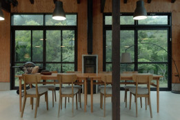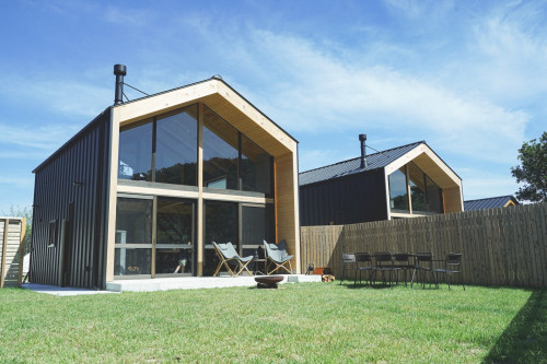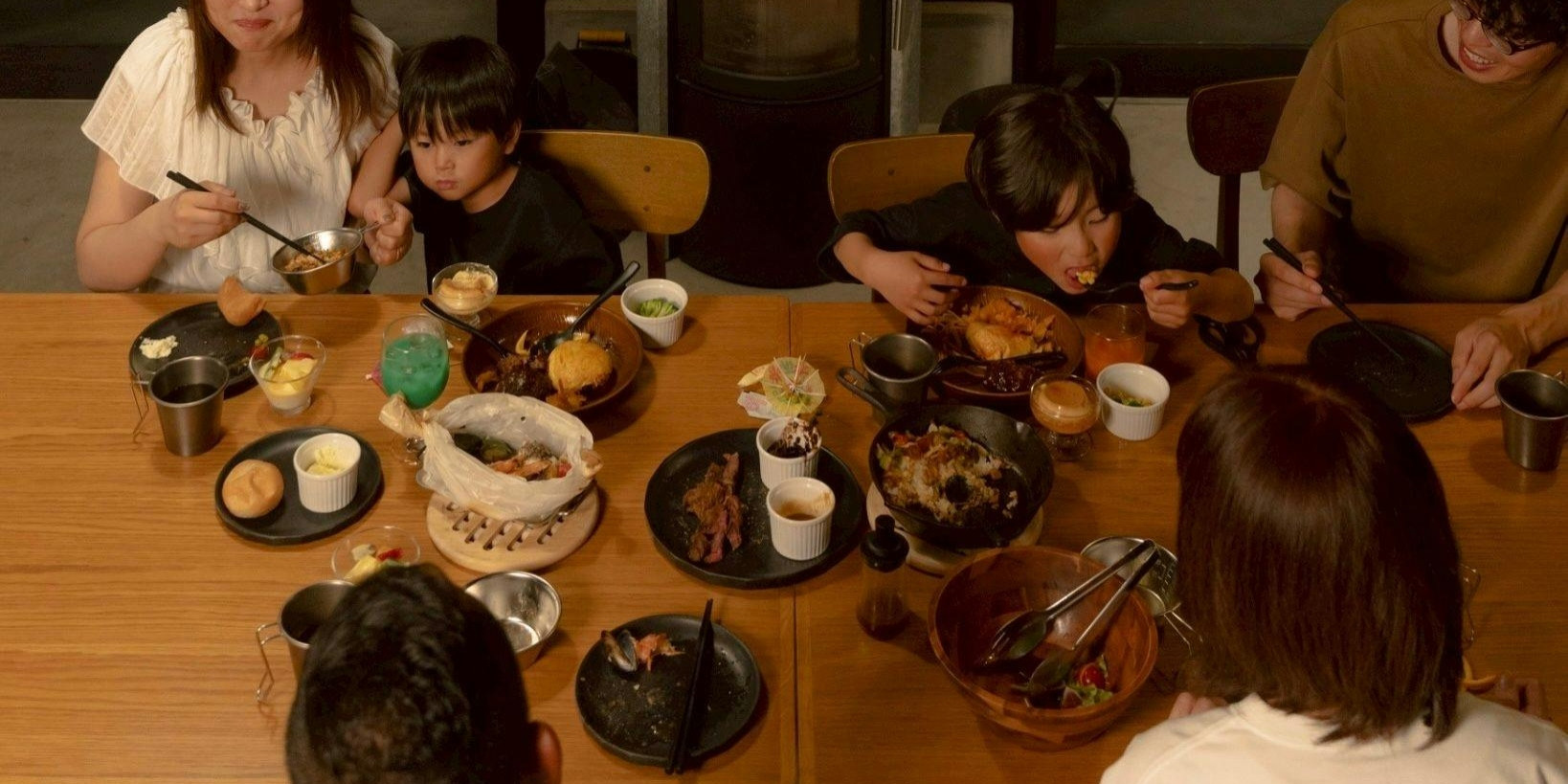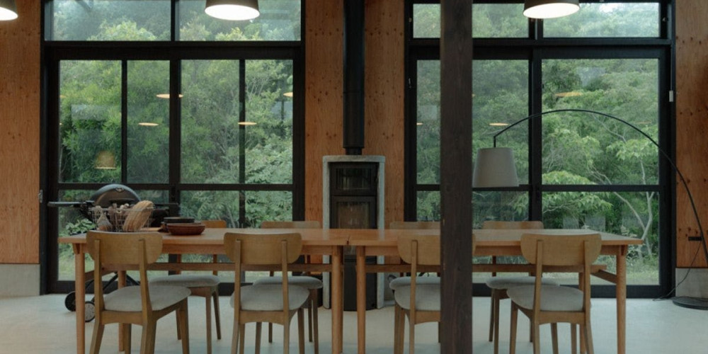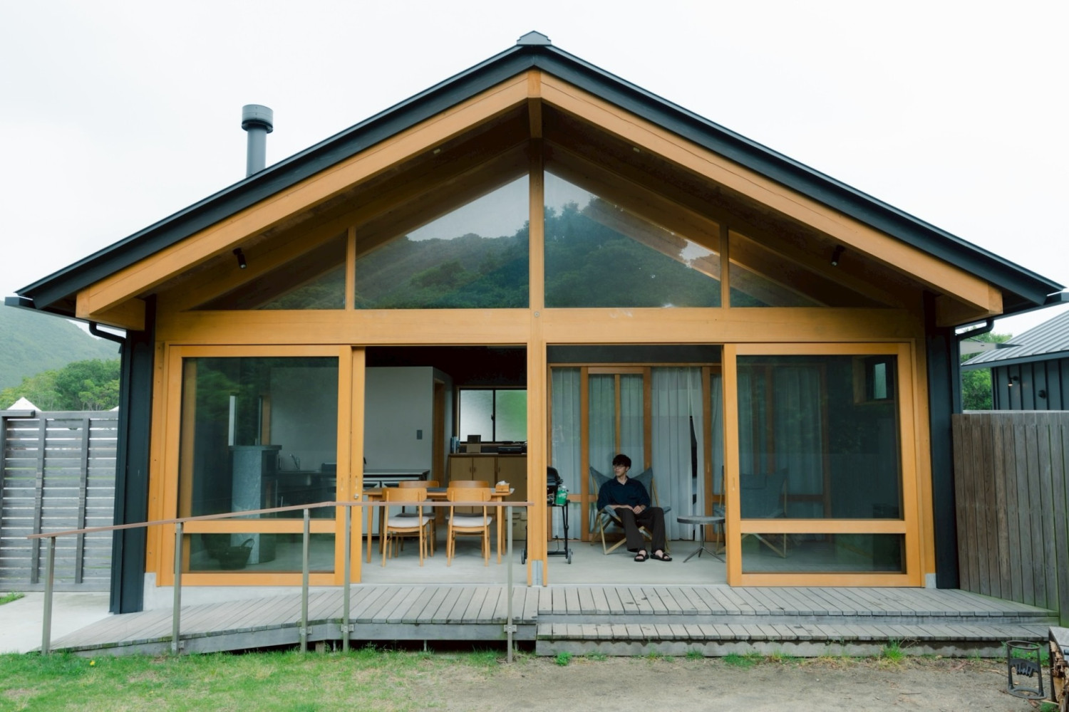 志原海岸をイメージした黒とグレーを基調としながら木の質感を大切にした落ち着いた空間です。Longhouseは古代ノルウェーの集会所を意味し、4台設置された薪ストーブ「NORN」により火の揺らめきを楽しみながら冬でも快適にBBQを楽しむことができます。上質なアウトドア体験をお楽しみください。