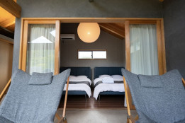 お好みやグループに合わせてキャビン、トレーラーハウス、グランピングテントが選べます。