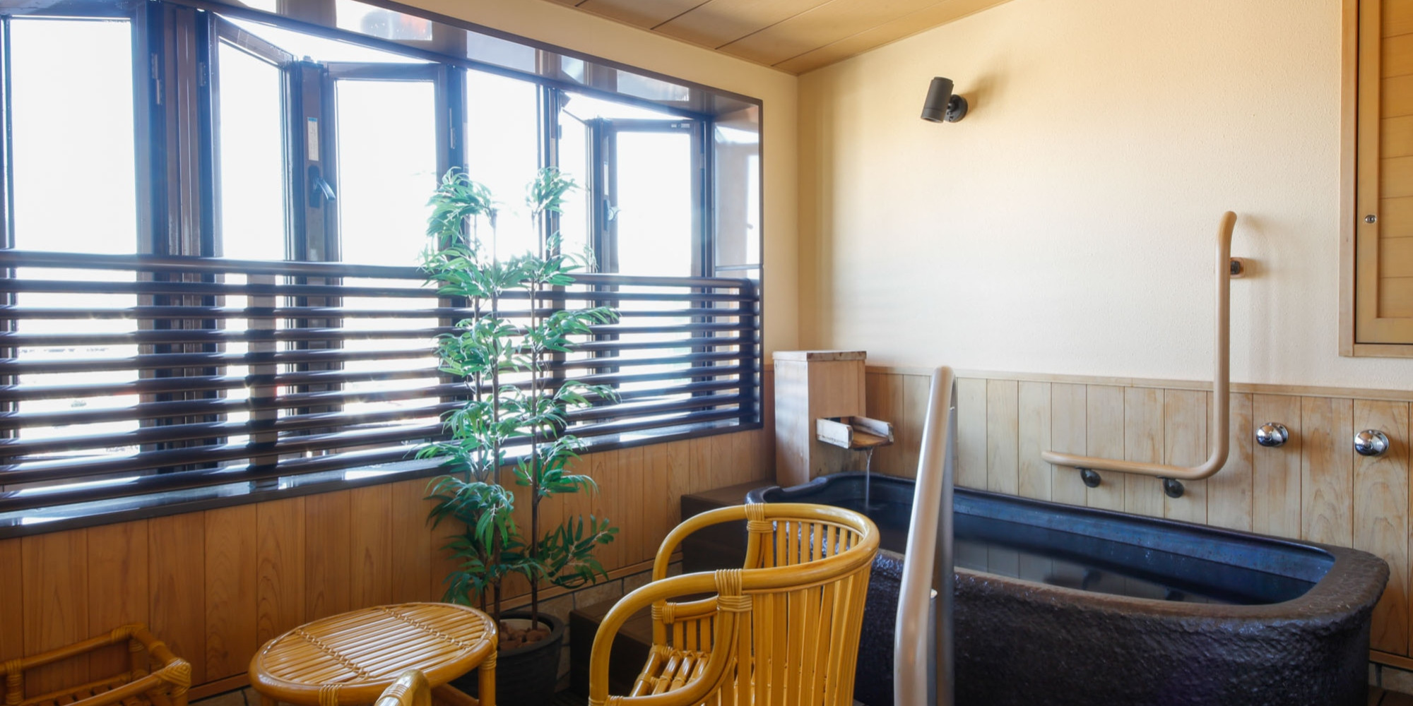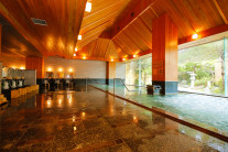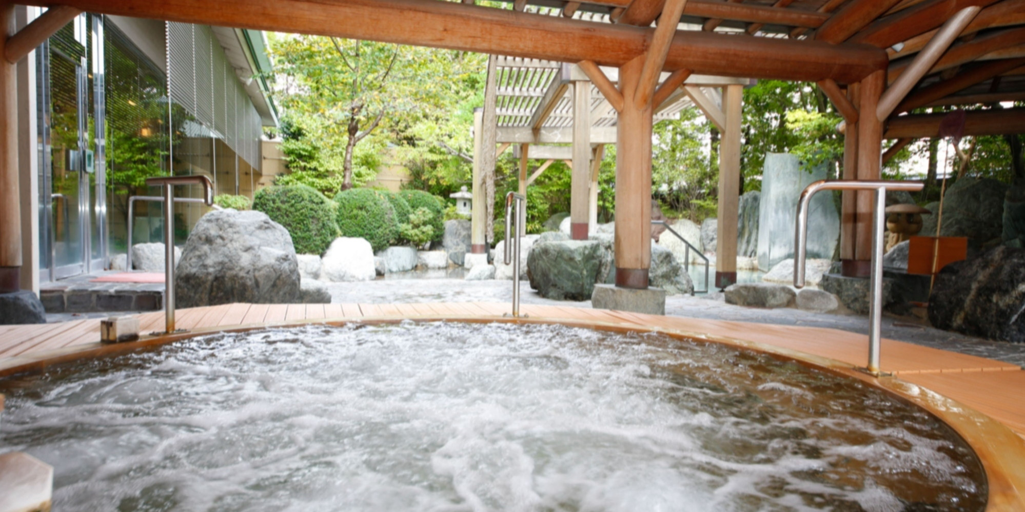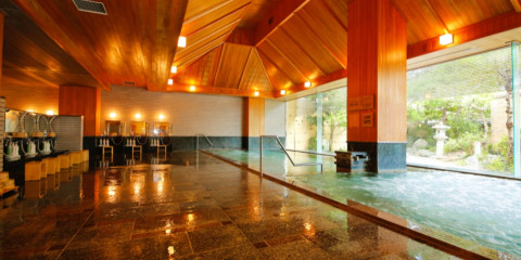 ホテル自慢の「本陣大浴殿」は、ガラス張りの壁一面から四季折々の情緒を感じられる開放的な空間。