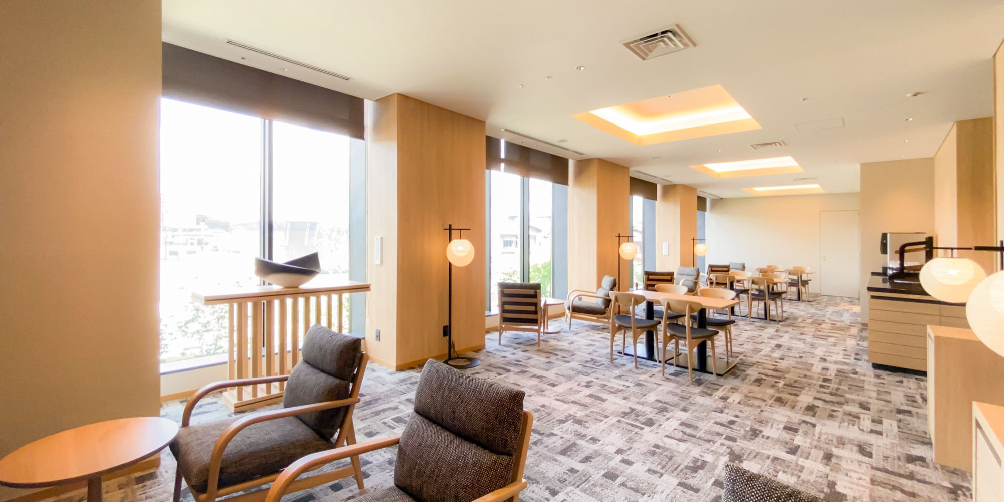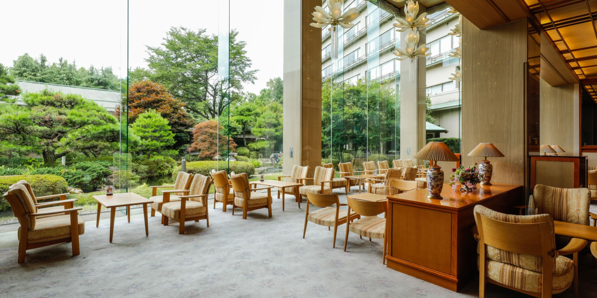 四季折々の姿を見せる日本庭園を眺めながらゆったりとした時間をおすごしいただけるラウンジ。