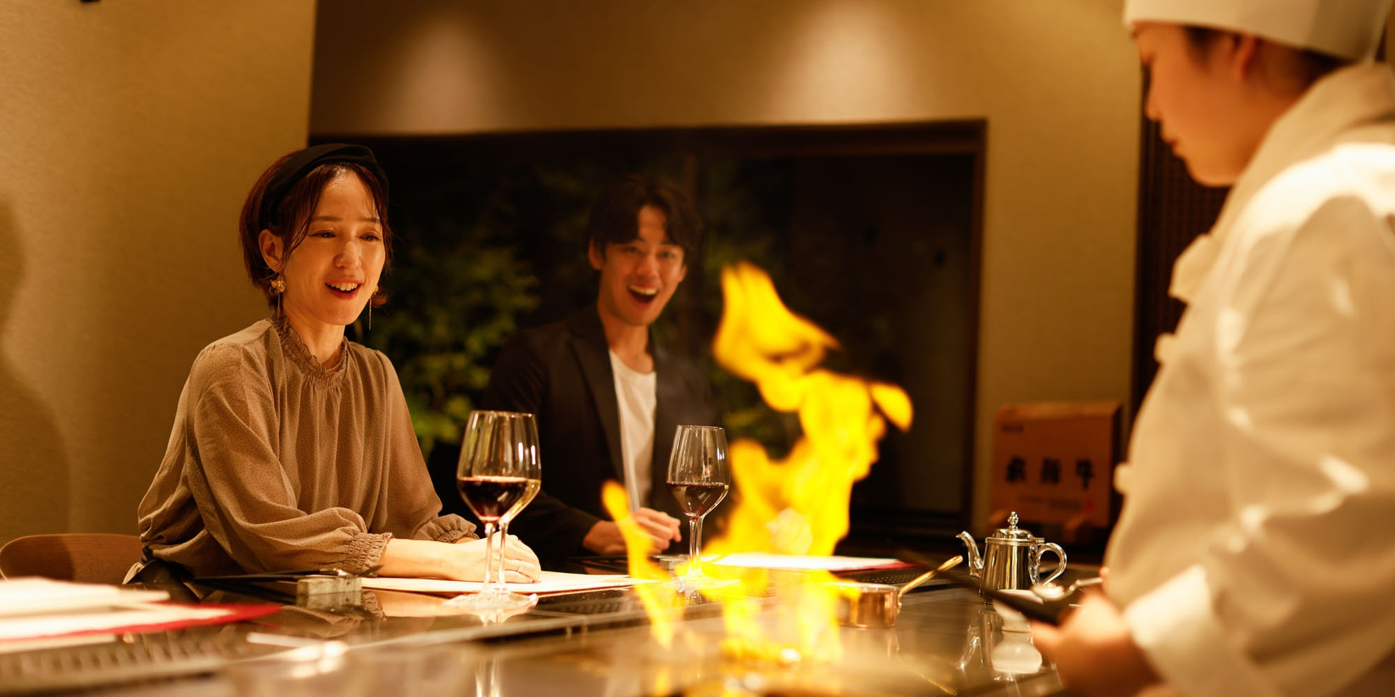 選びぬかれたブランド牛「飛騨牛」、旬な魚介、地野菜などシェフの技も鮮やかに皆様の目の前で調理いたします。