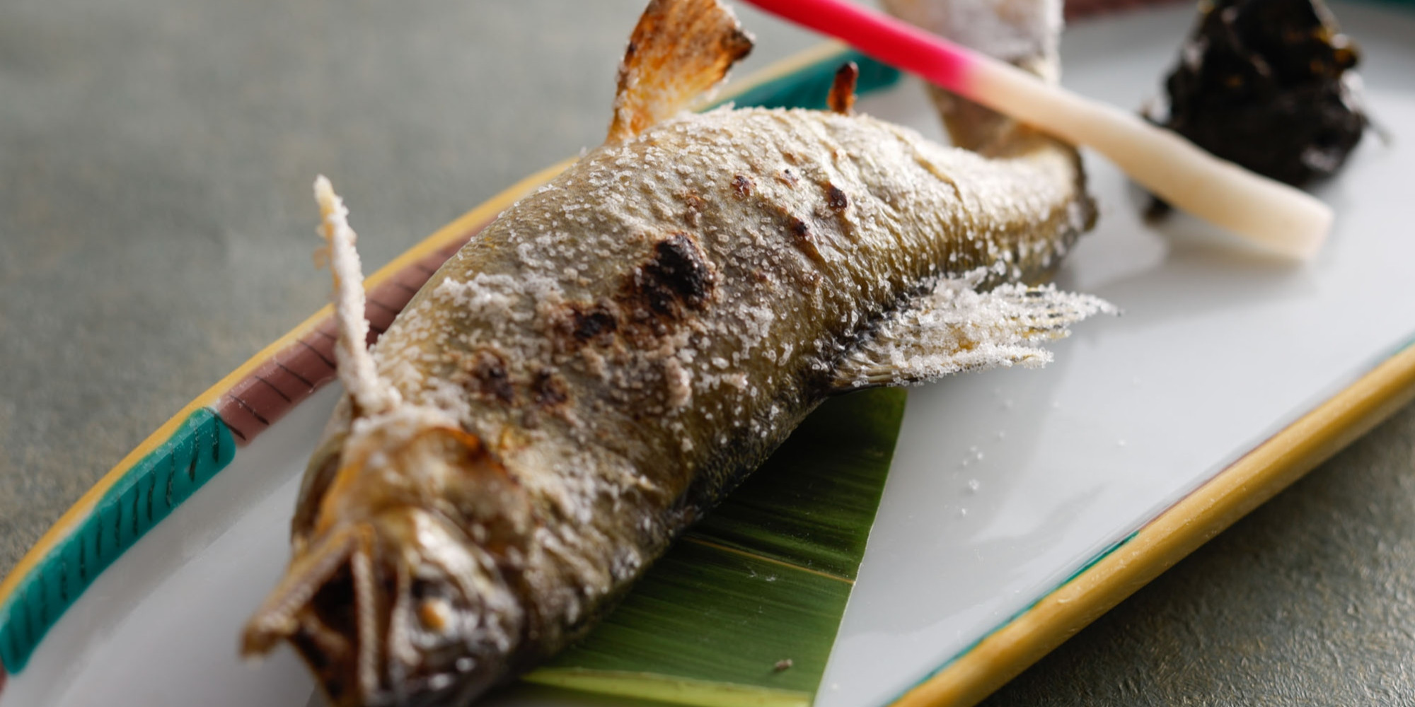 地元で採れた⼭菜、鮎や岩⿂等の塩焼きなど、炭火を囲んで郷⼟料理をいただけます。