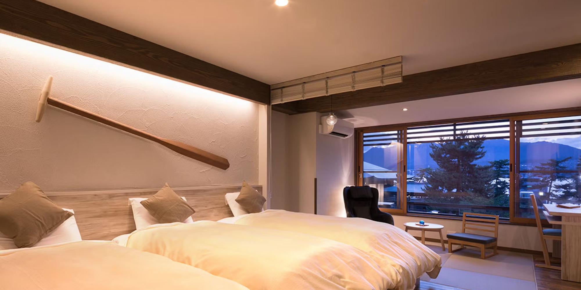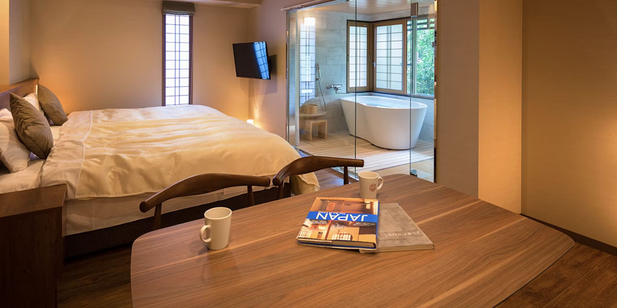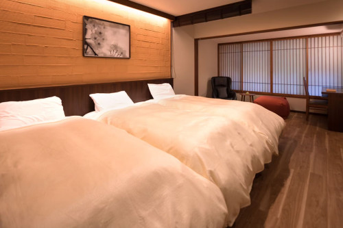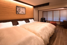 「町家・海・山」の3つの宮島の別荘をイメージした和モダンで、上質でシンプルなインテリアデザインの客室へは靴を脱いで入室していただきます。