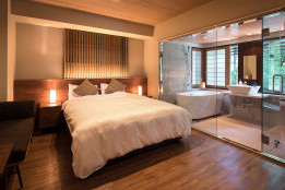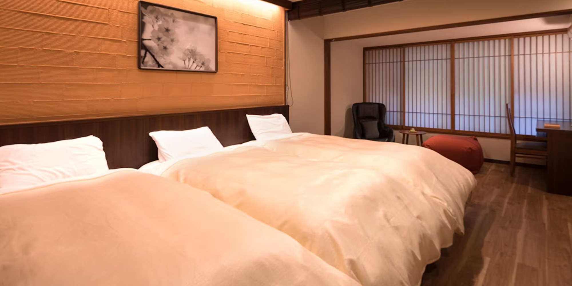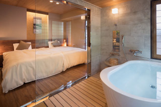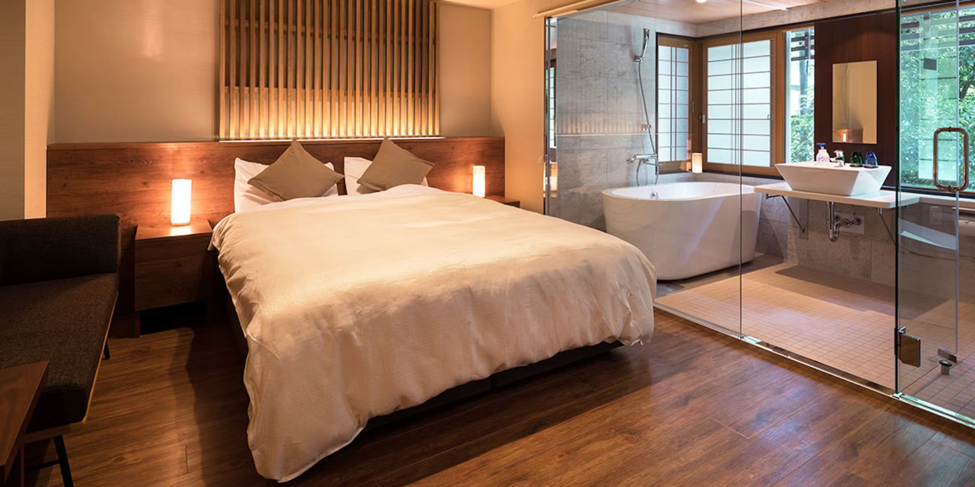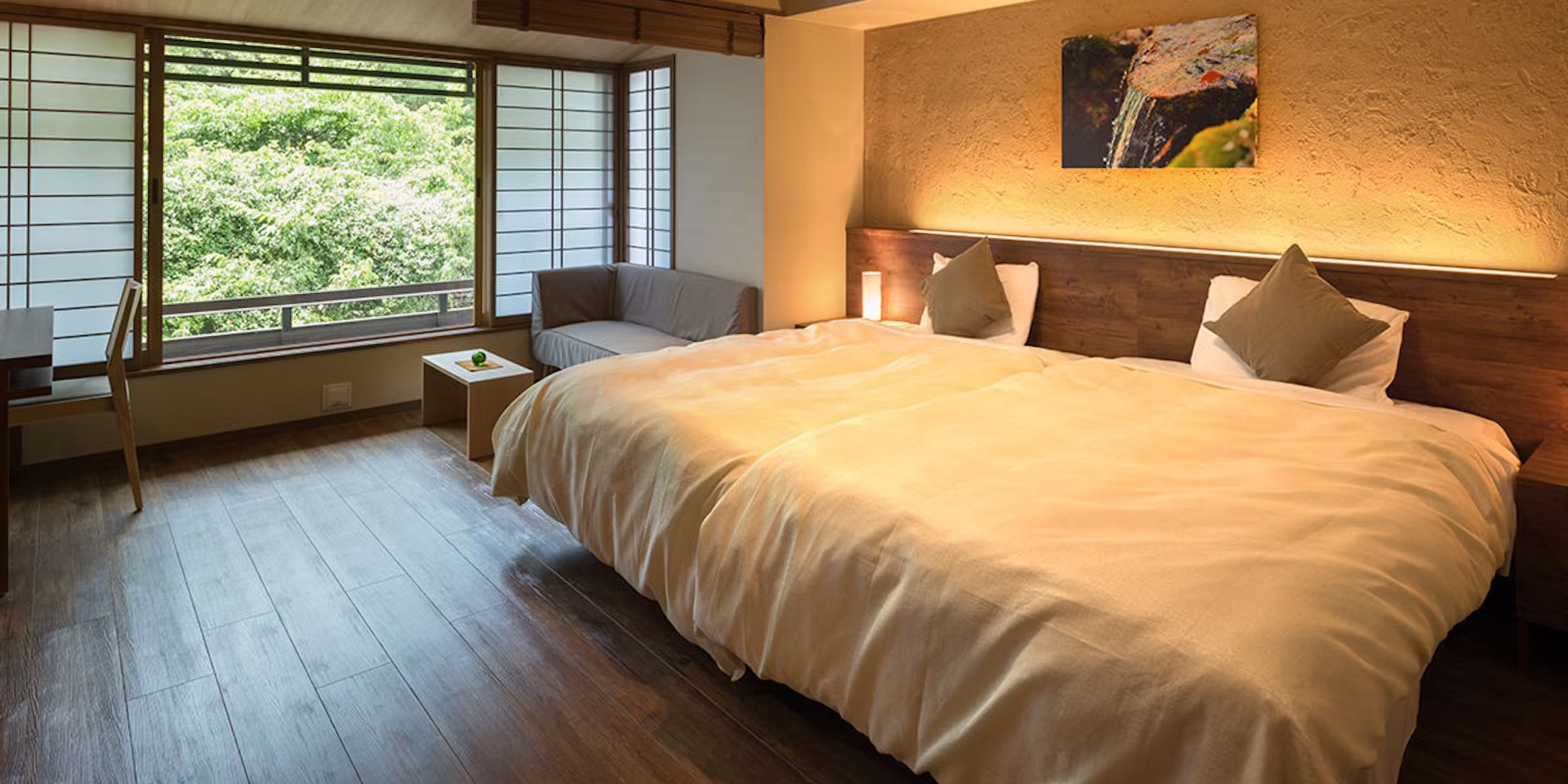 「町家・海・山」の3つの宮島の別荘をイメージした和モダンで、上質でシンプルなインテリアデザインの客室へは靴を脱いで入室していただきます。