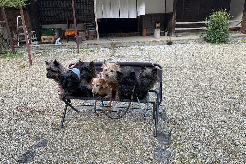 犬の同伴もOKです。別途一泊あたり4400円いただきます。宿泊所の前の庭でドッグランもでき、また近くの川で遊ばせることもできます。