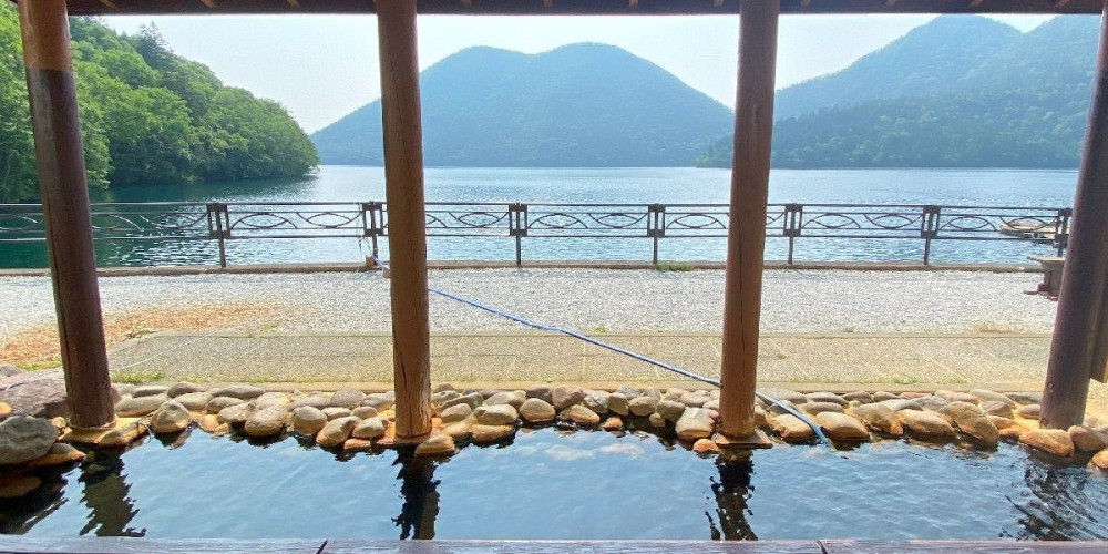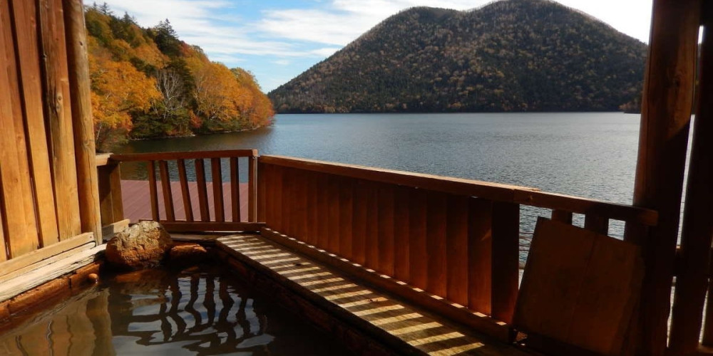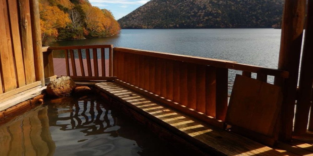 湖畔を渡る風が肌に心地良い源泉100%の露天風呂から一望するのは静かな湖畔と、