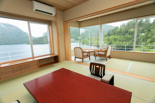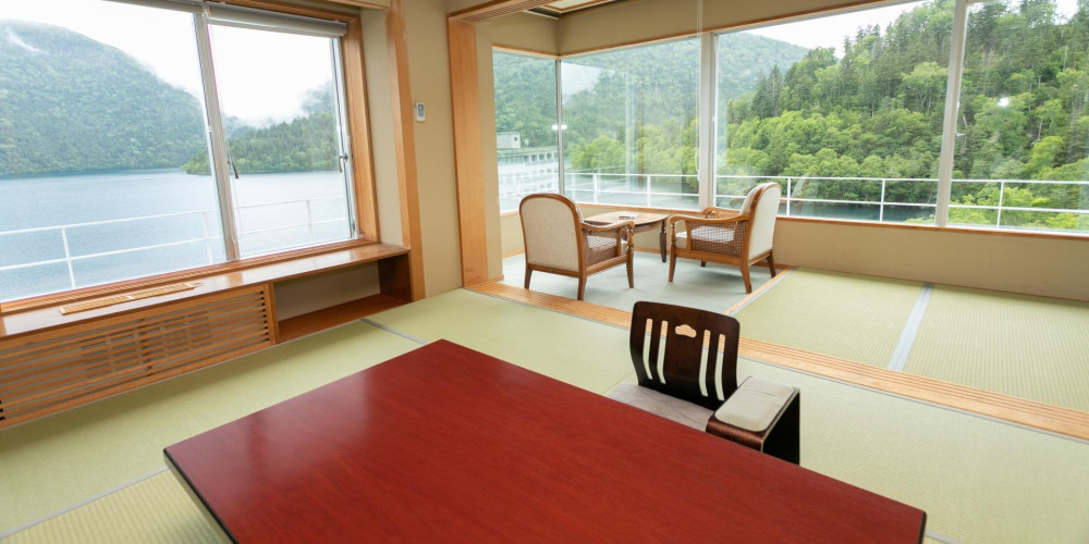 まるで水面に浮いているかのような感覚で湖を見渡せる、全室レイクビューのお部屋です。