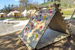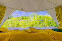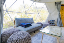 たまねぎ型の可愛らしい形状のロータスベルテント、ユニークな形状のドーム型テント、 2種のグランピングテントに泊まれる各お部屋は80㎡以上のウッドデッキに設置。
