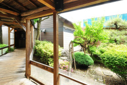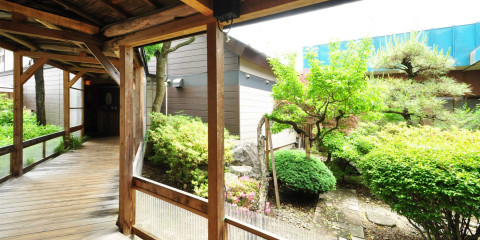大浴場へ続く渡り廊下では、趣ある中庭を眺めることができます。