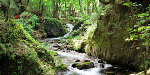 龍泉洞の清水が流れる渓流も苔生して緑が深く絶景です。