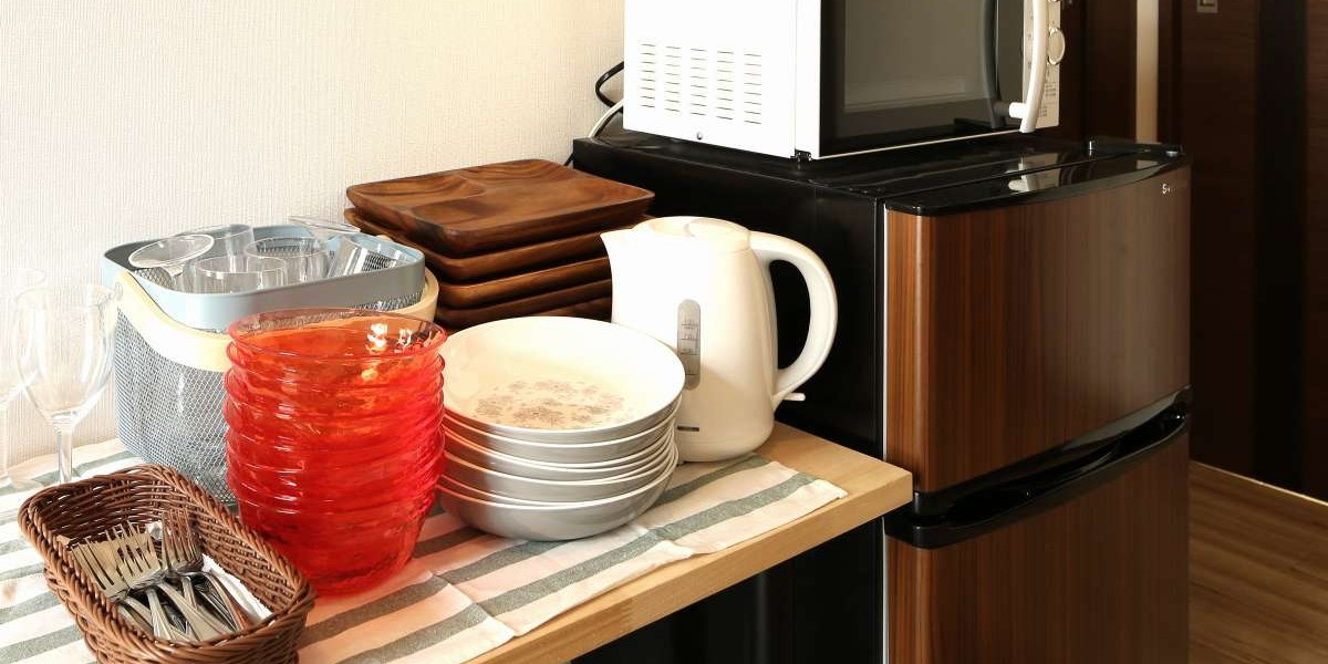 シャンプー・リンス・ボディソープ・石鹸・タオル・バスタオル・ハミガキセット・ドライヤー・洗顔料・メイク落とし・冷蔵庫・湯沸しポット