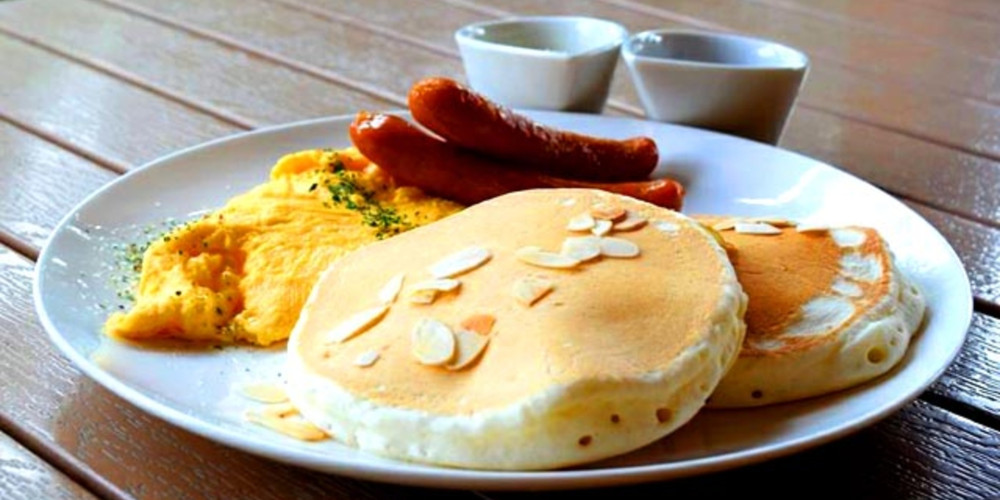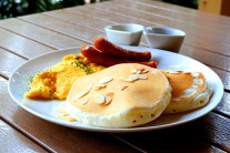 朝食はパンケーキ、珈琲、おしゃれにリッチにお過ごしいただけます。自然の静けさに包まれながら素敵な朝食時間をお楽しみください。