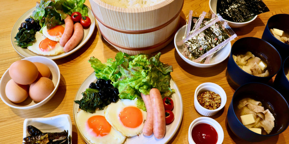 朝食は、お米・卵・野菜・お肉など地元の食材を使用したお食事を、セルフクッキング形式で提供いたします