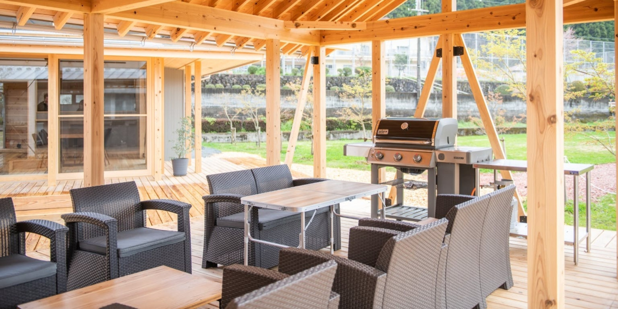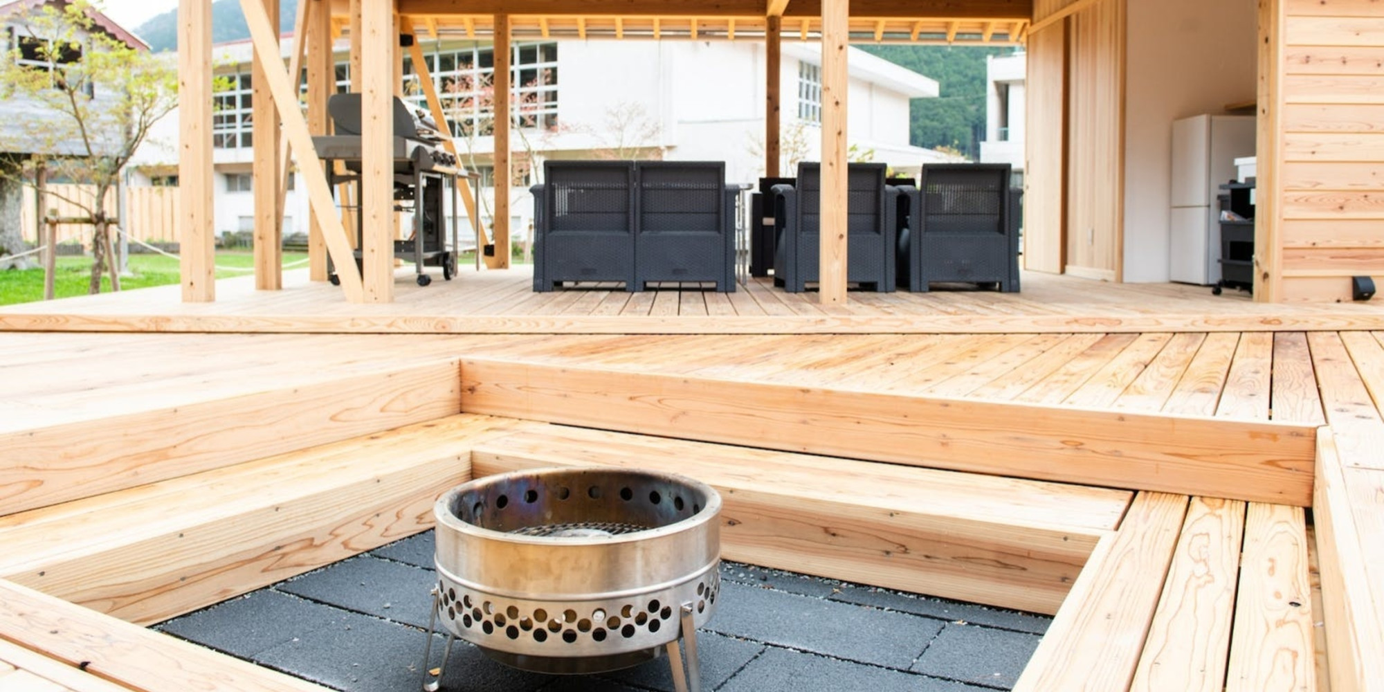 防炎処理を施したウッドデッキで楽しむ、焚き火とBBQ。