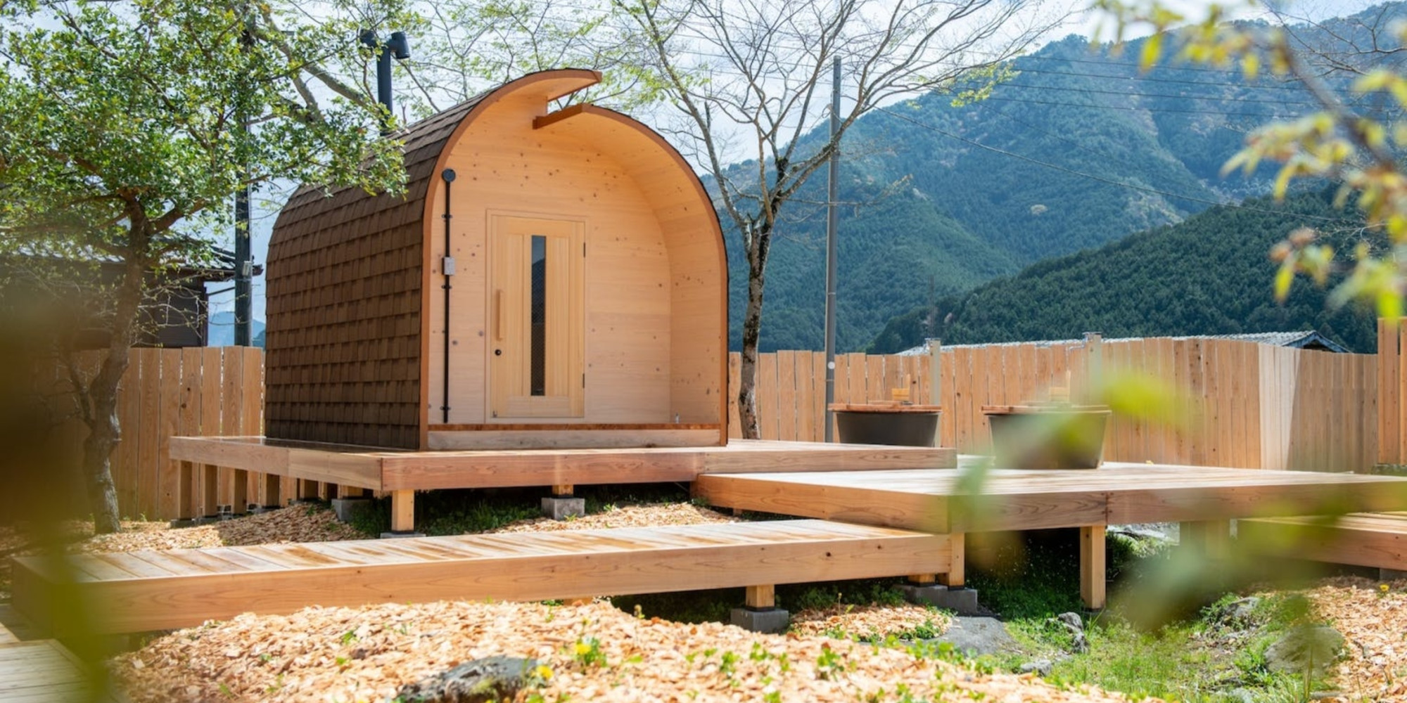 兵庫県丹波市の廃校利活用施設「FOREST DOOR -旧神楽小学校-」のグラウンドに建つ、貸切サウナ付きの「木を楽しむ一棟貸しの宿」。