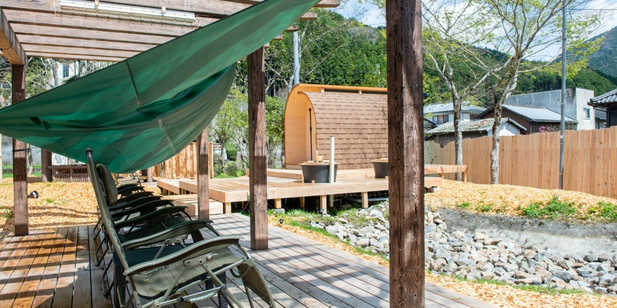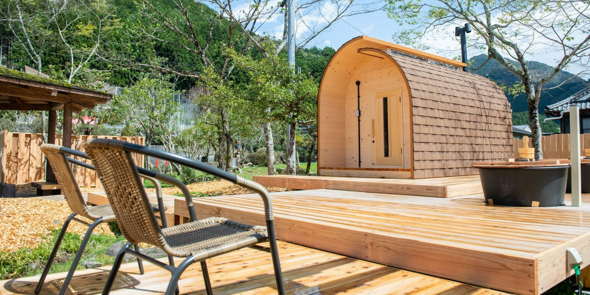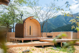 小学校時代の藤棚を活用したエリア、体育館横に佇むのは地産地消の本格バレルサウナ “YOKI SAUNA” です。
