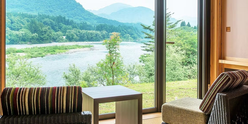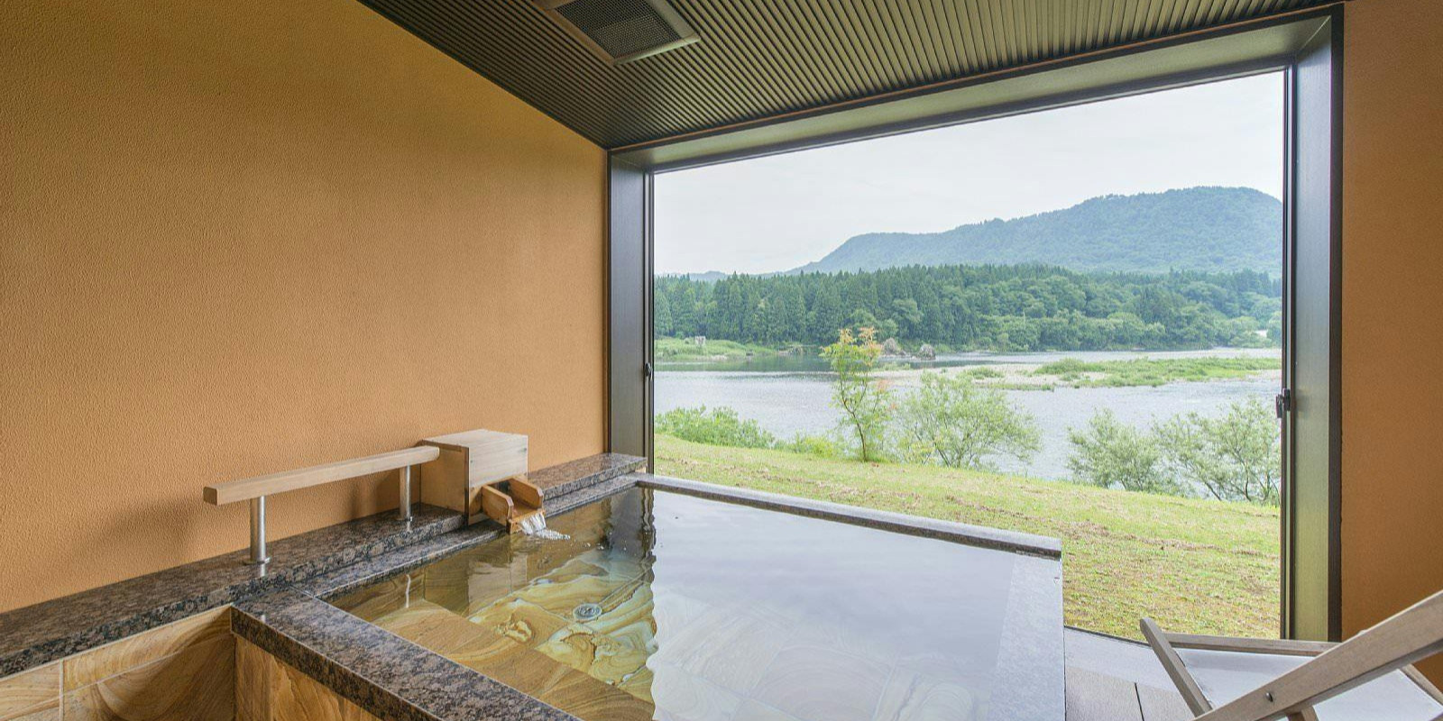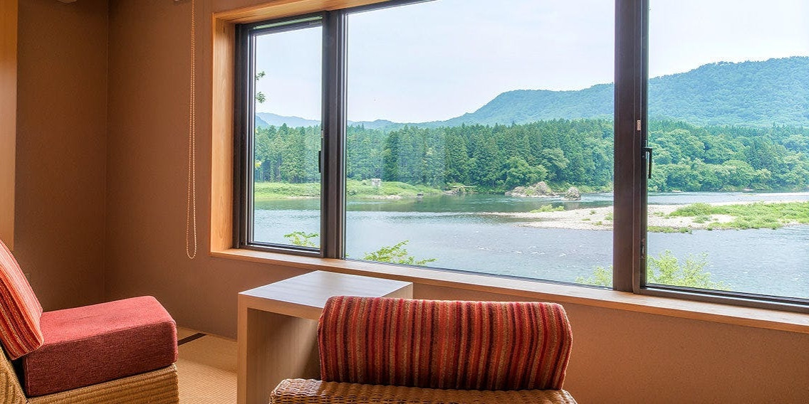 広い窓の向こうには、日本でも有数の大河川としても有名な阿賀野川(あがのかわ)が流れ、大自然が広がります。