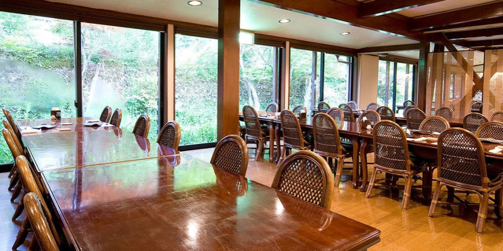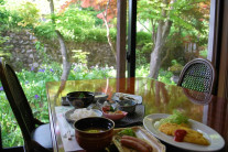 夜にはもみじのライトアップ、朝には木漏れ日の差し込むレストランです。