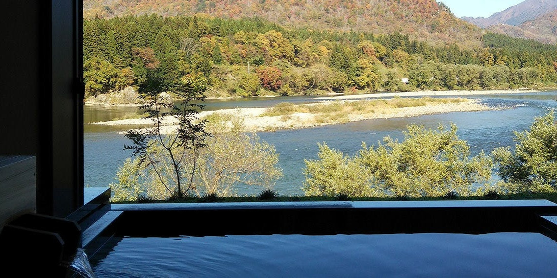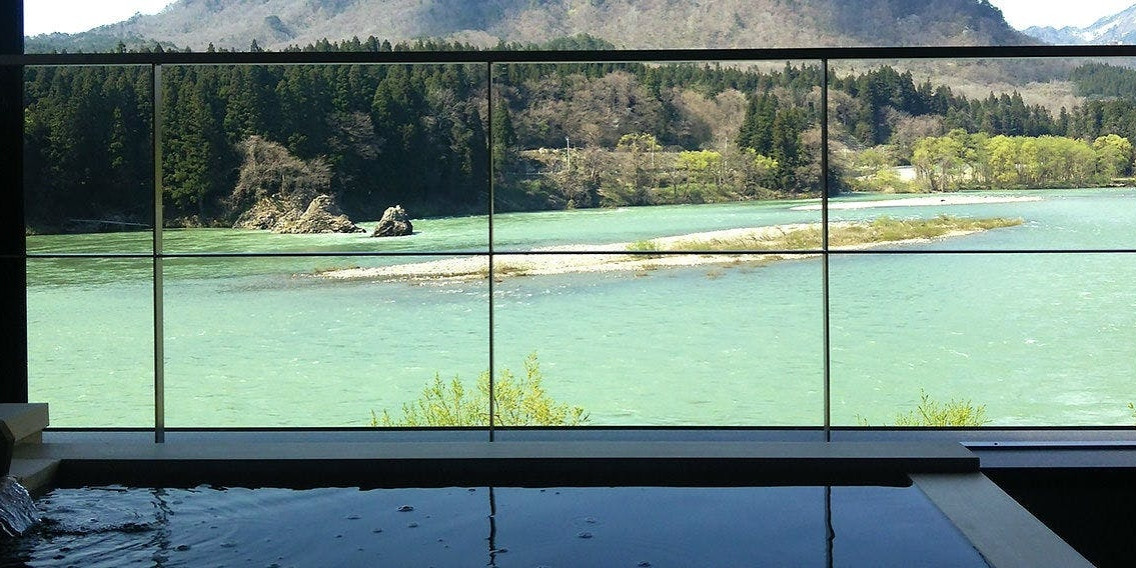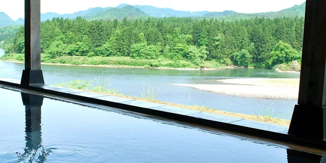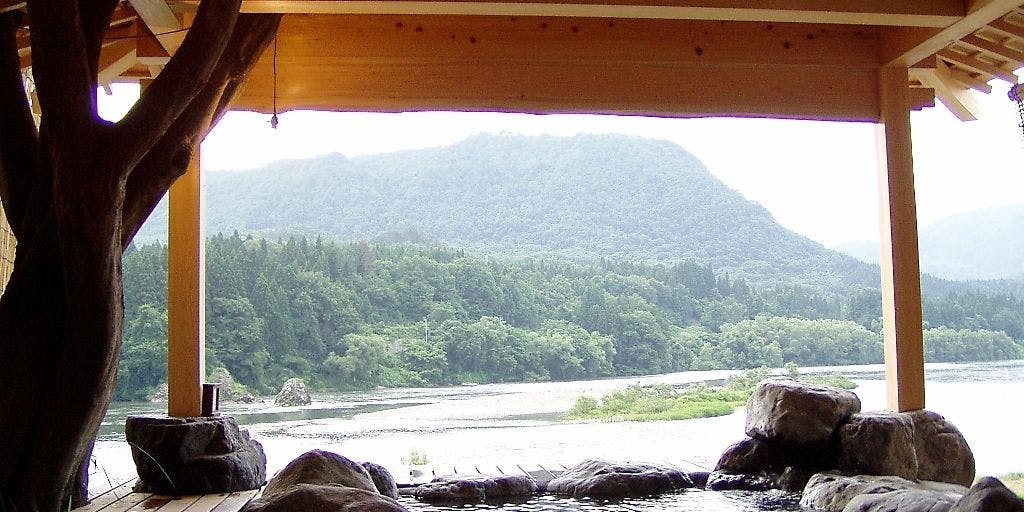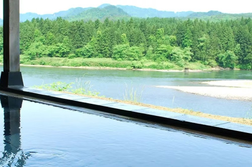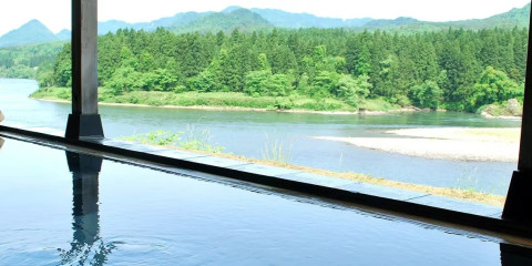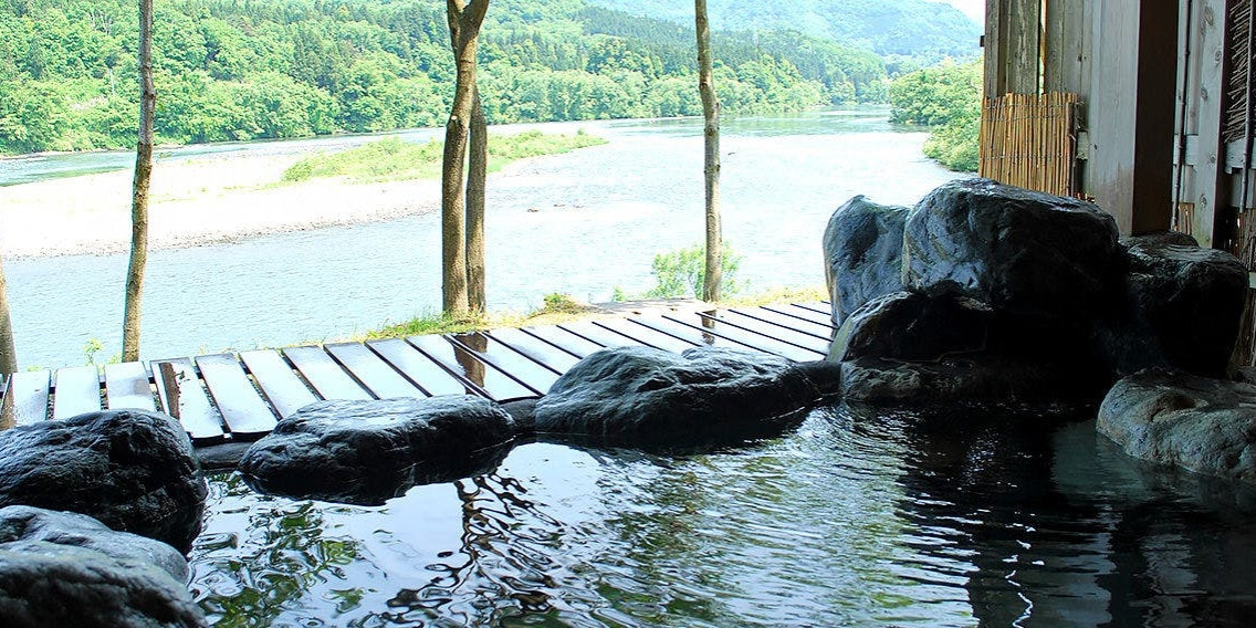 目の前に阿賀野川を望む絶景の露天風呂。天然の温泉を十分にお楽しみいただけます。