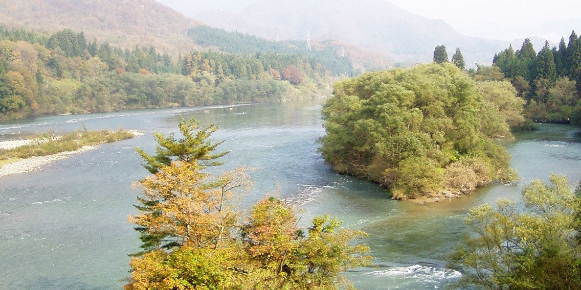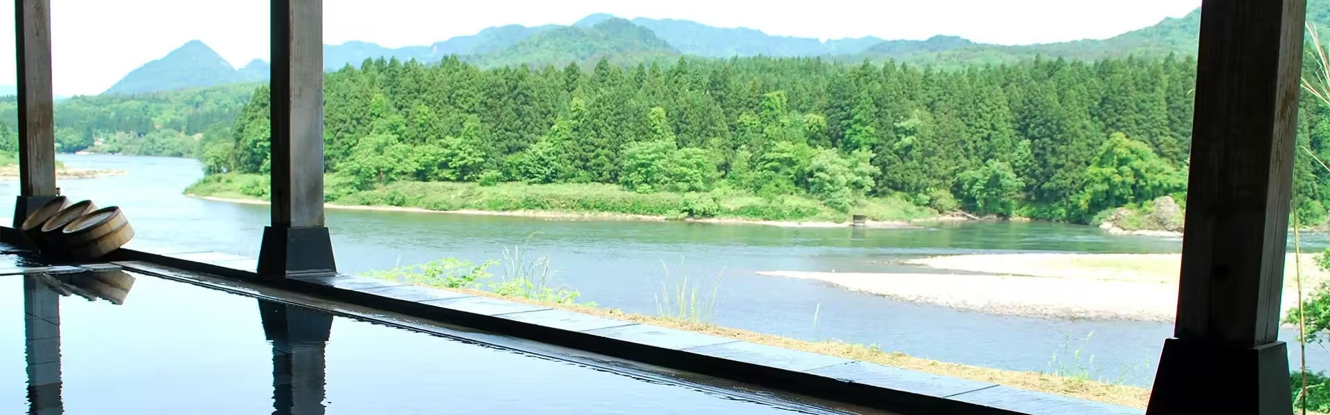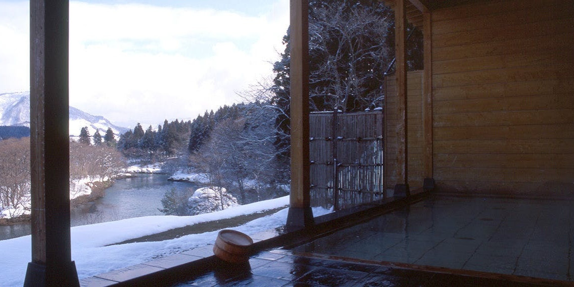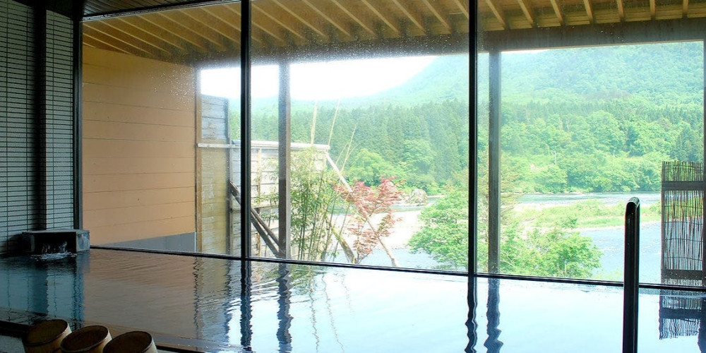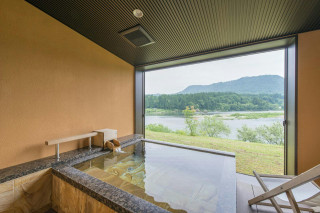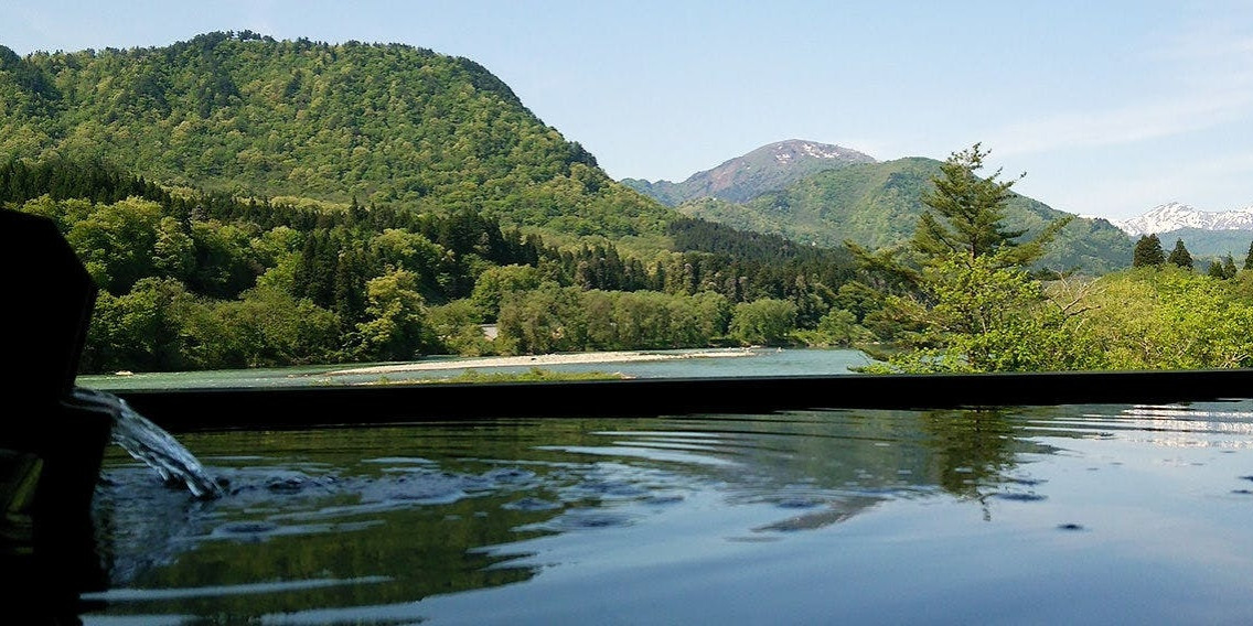 目の前に阿賀野川を望む絶景の露天風呂。天然の温泉を十分にお楽しみいただけます。