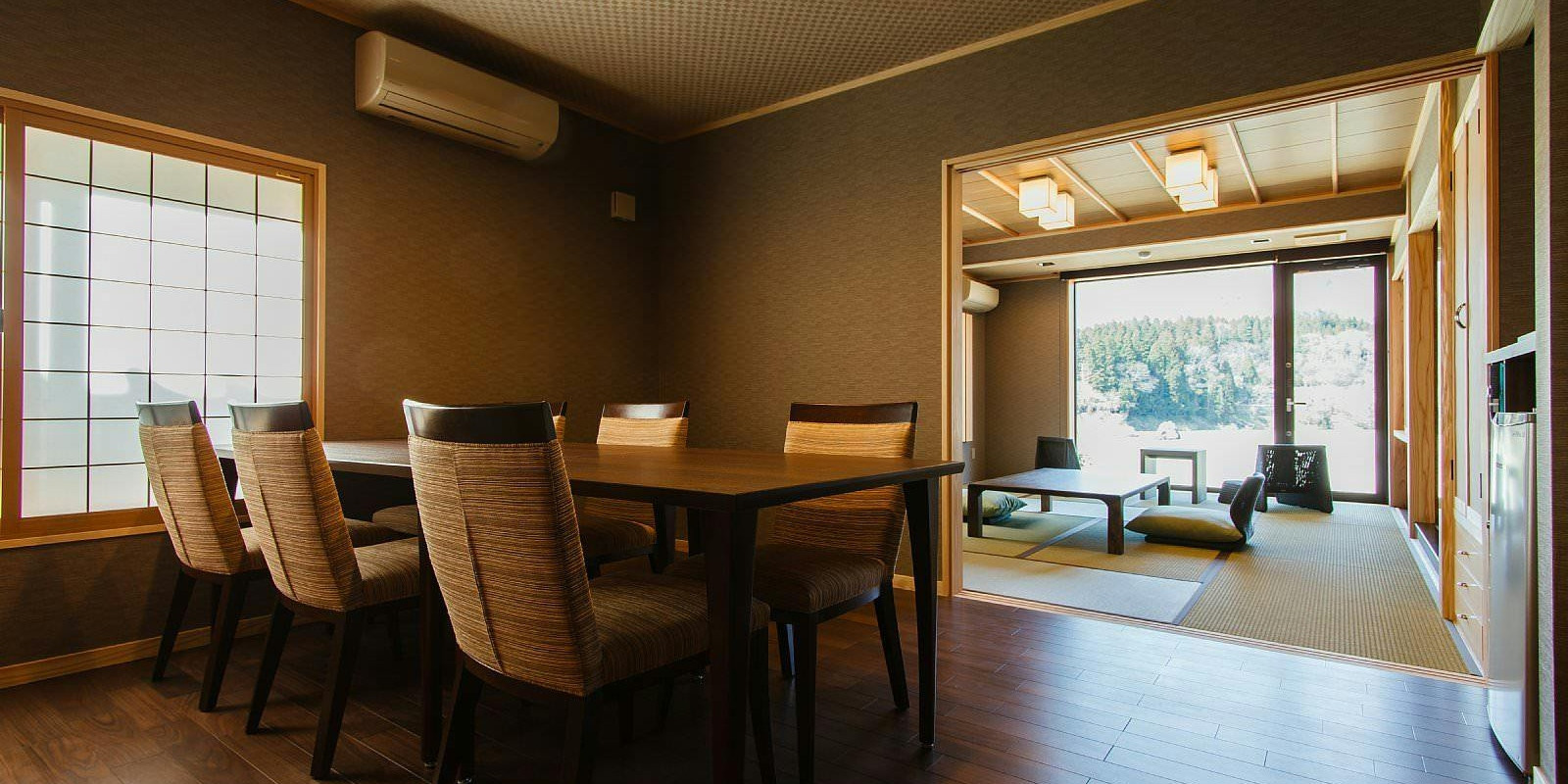 「せせらぎ」はツインベッドルーム・ダイニングルーム・モダン和室・全開放のできる窓付き露天風呂がございます。