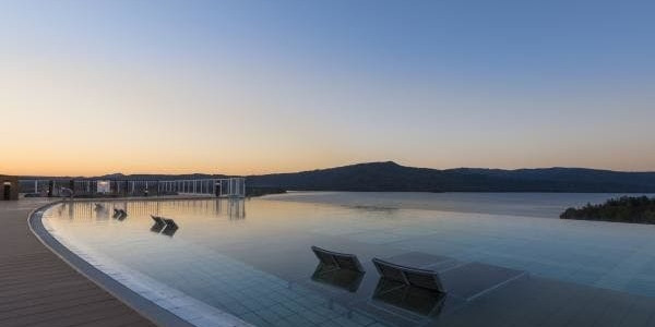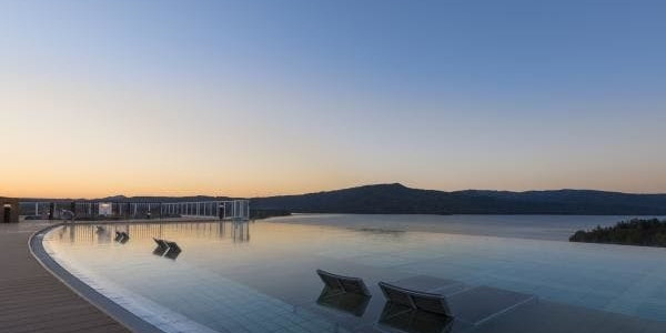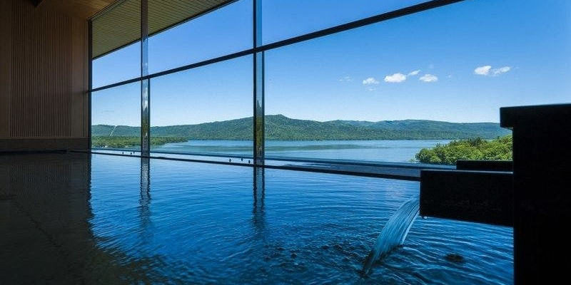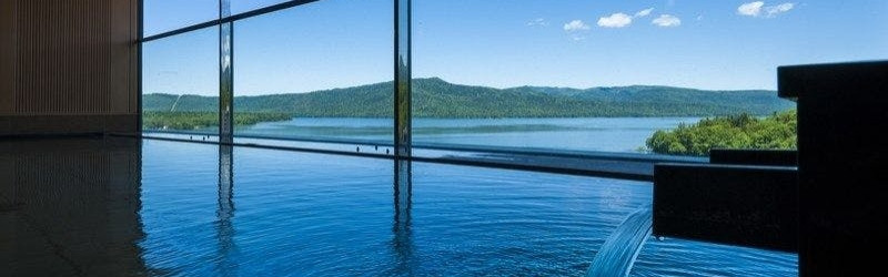 スパと阿寒湖が一体になったかのように見えるインフィニティ・エッジ・スパ。