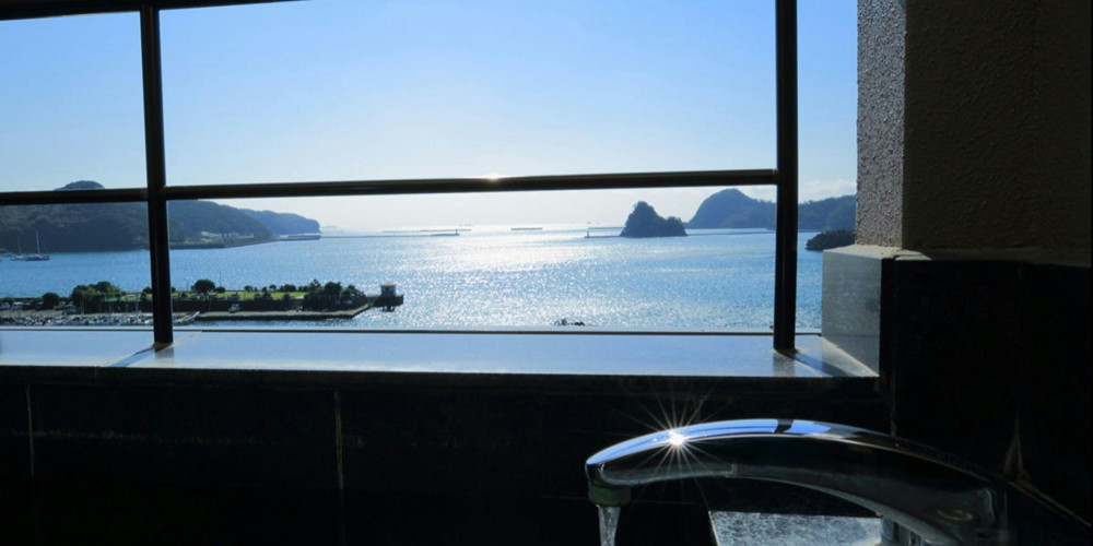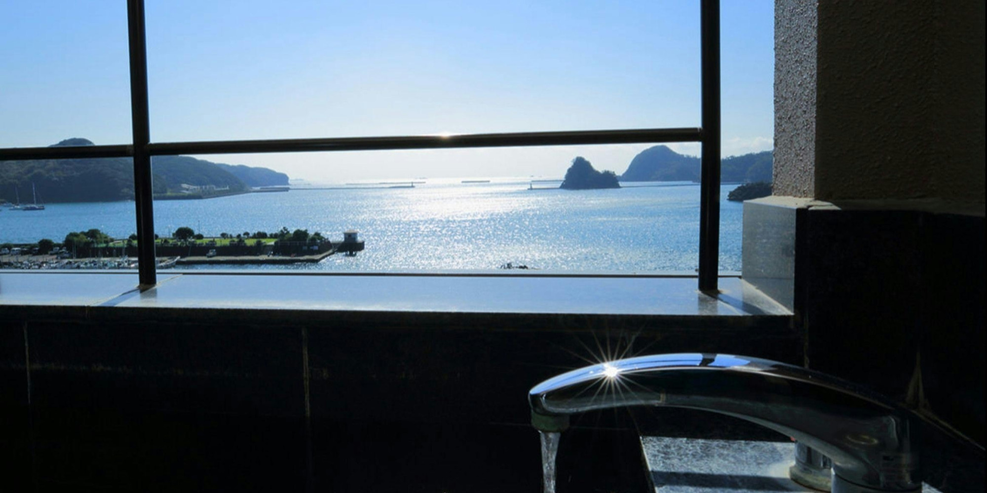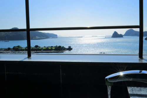 下田聚楽ホテルの銘石露天風呂と檜の内湯は、下田湾の絶景と共に癒しの時間を提供します。