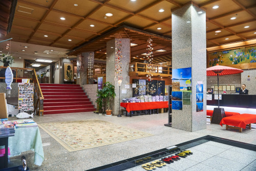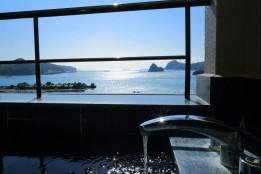 銘石露天風呂や檜の香り満ちる内湯で心身を癒し、客室専用露天風呂からは海と空の大パノラマが広がります。