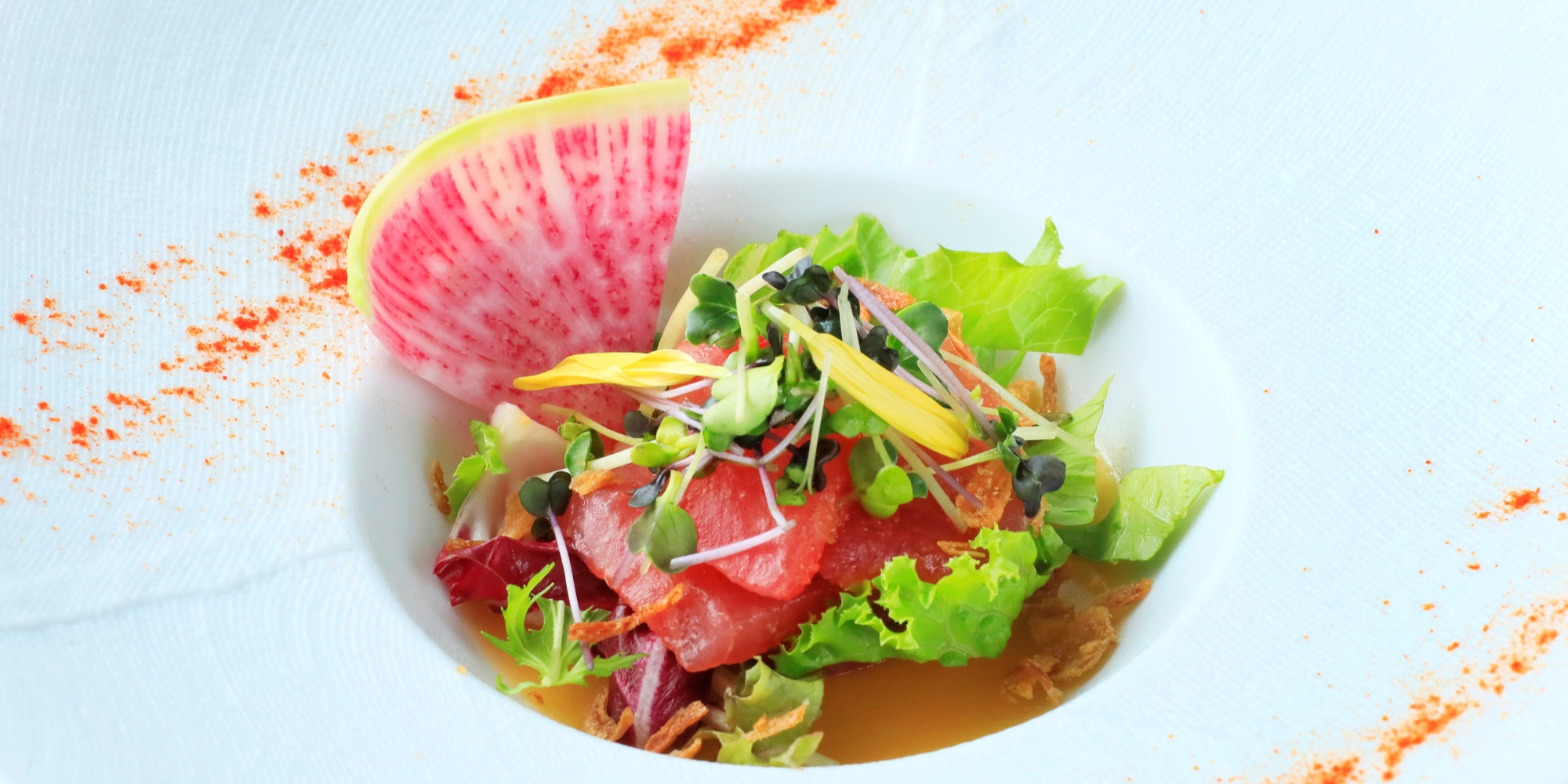 料理長との会話や鉄板から上がる炎の演出をお愉しみいただけるライブキッチン前のカウンタースペース、カップルでゆっくりとお召し上がりいただけるカップルシート、ほかのお客様との目線が合わないように配置したテーブルの空間まで、美食をゆっくりと愉しめる空間創りに拘りました。