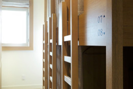 部屋は男女別で、木のぬくもりが優しいバンクベッドを8つずつ設置。