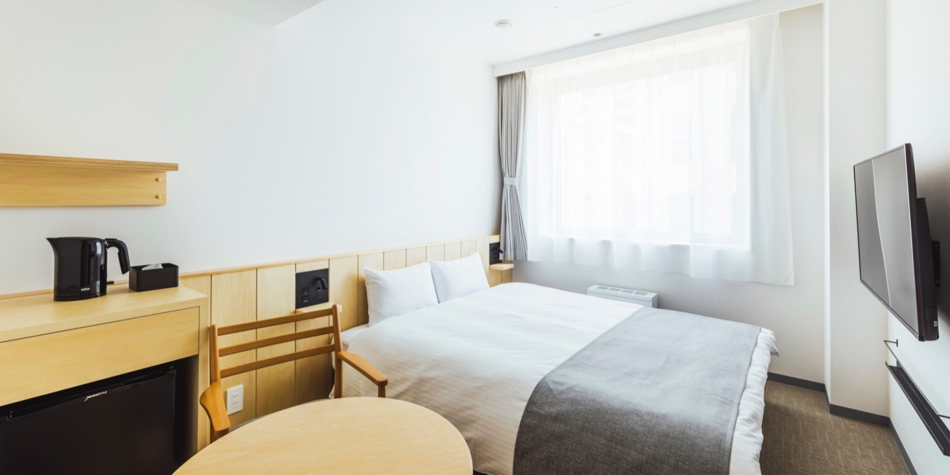 ベッド幅160cmの大型ダブルベッド。Aタイプはセパレート型シャワー付き(浴槽なし)。20㎡以上の広々したお部屋です。