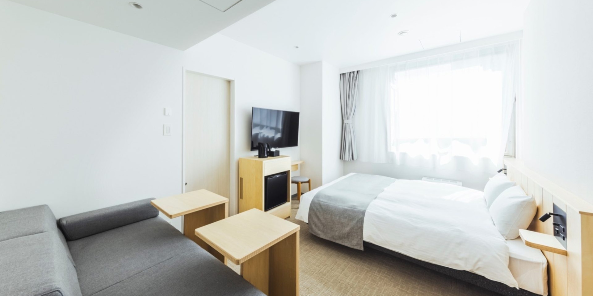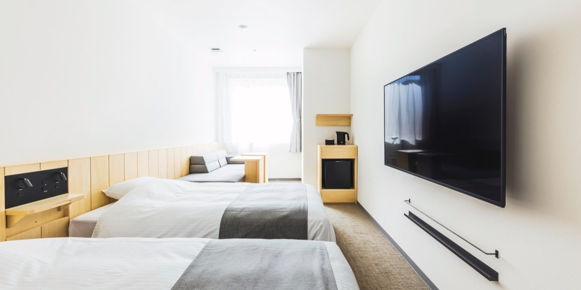 ベッド幅120cmのツインルーム。セパレート型ユニットバス付き。広々ソファはベッドにもなり、最大3名での宿泊も可能。