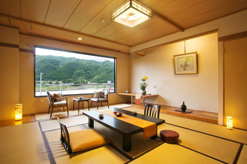 川側のお部屋からは、阿賀野川や地元の宝珠山を眺めることができ、