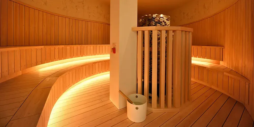 またシャワーブース、水風呂、フリードリンクを用意した内気浴スペースを設けており水風呂の湯船を照らす光が壁や天井に映し出す、