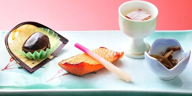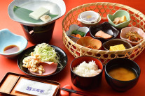 料理長自慢の出汁で煮る「山菜煮物椀」に旬の高原野菜柔や山菜を使う「季節の天ぷら」と「季節の鍋料理」。