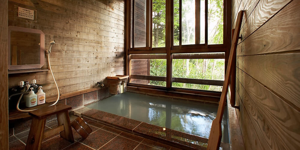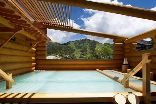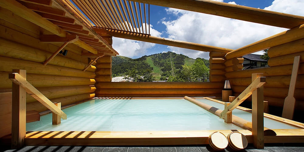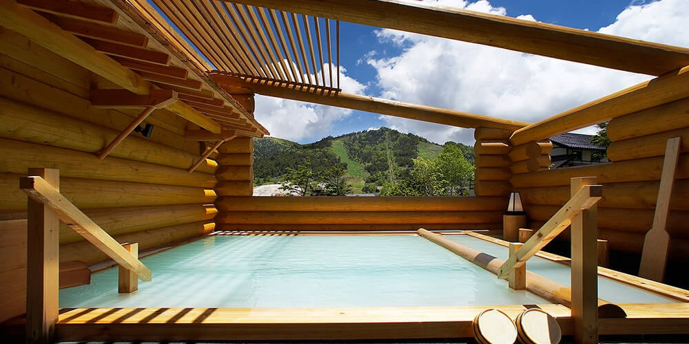 標高1,800m、乳白色のかけ流しログ露天風呂