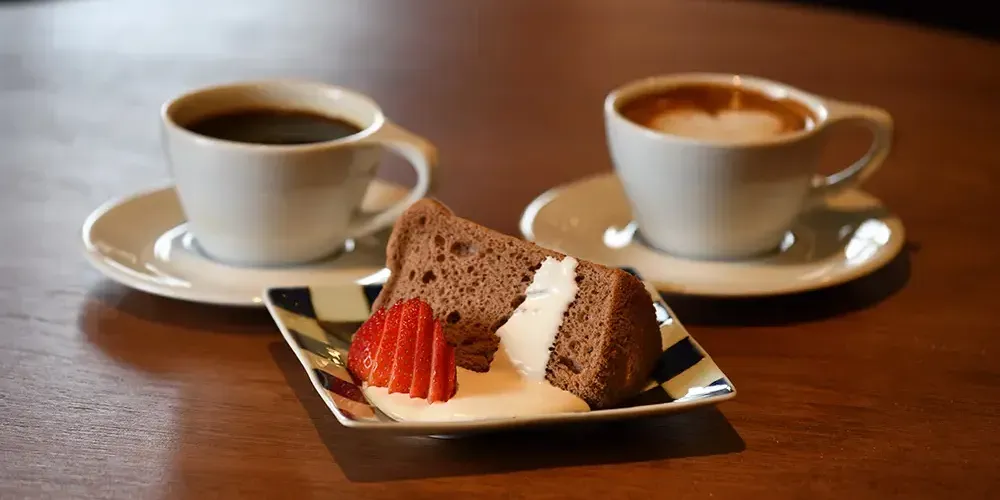レッドエスプレッソ・レッドカフェラテも含めたヘルシーなルイボスティーメニューに、プレーンとココアが選べる手作りのシフォンケーキなど。