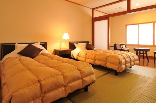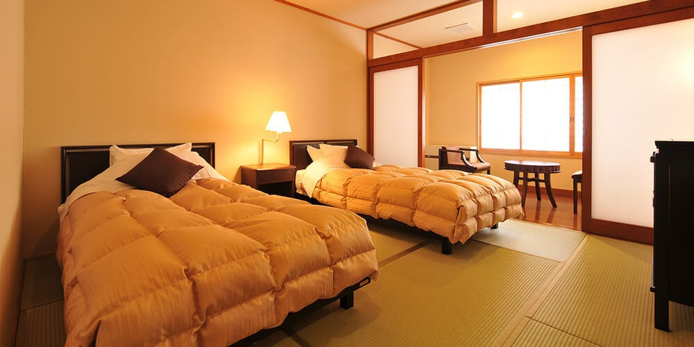窓から眩い光と高原の風が吹き込む本館「和洋室」。独立した広いツインベッドルームを備えておりますのでゆったりとお過ごしいただけます。