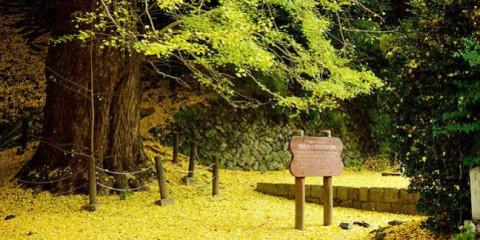 樹齢約700年、天河大辨財天社を詣でた弘法大師が植えたといわれている、直径2mをこえるイチョウの大木です。紅葉の季節には写真のようにあたりいちめんが黄色いじゅうたんに。