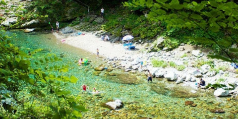 宿からみたらい渓谷の方へ5分も歩けば、このように川遊びできる場所がいくつも。いかがですか、この澄んだエメラルドグリーン!