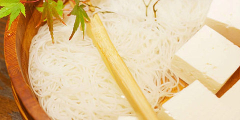 基本メニューの「吉野葛うどん」に代えて、天川村・福西豆腐店製とうふの冷や奴味比べ、岡下製麺所の二日仕込みそうめん「天の川糸」の桶をつけるオプションです。