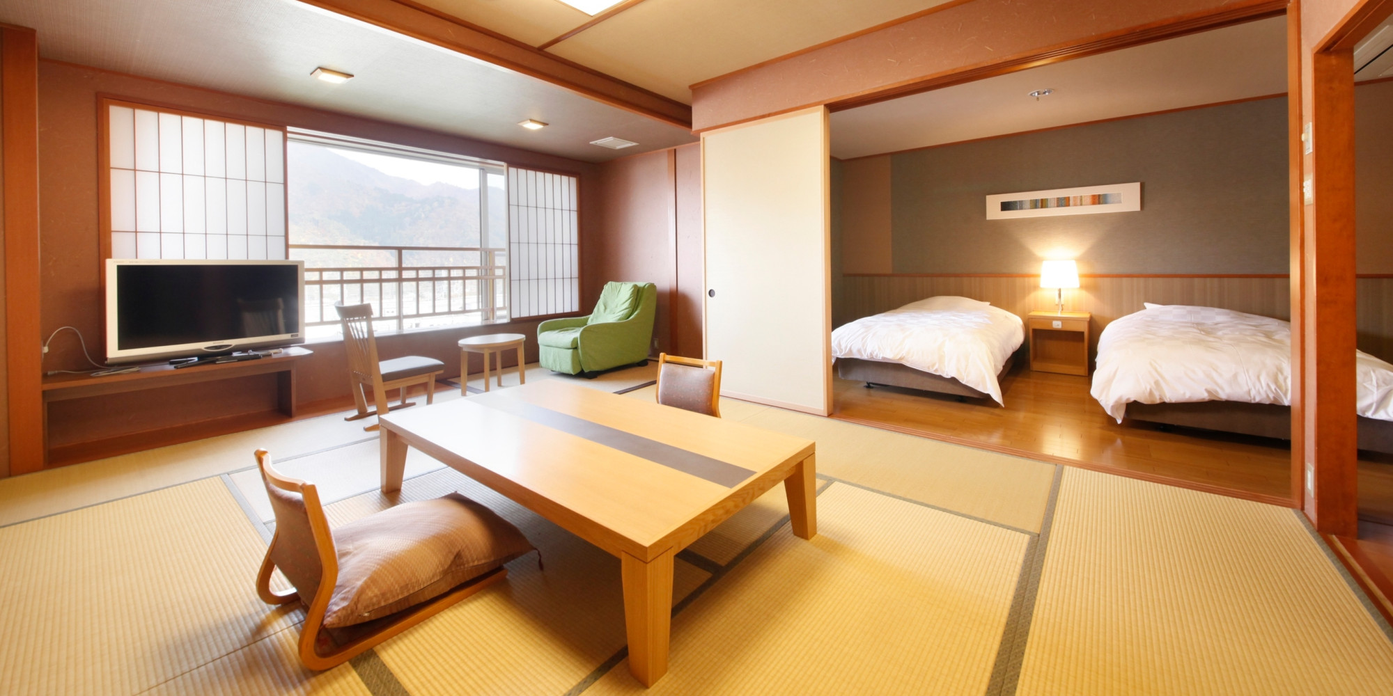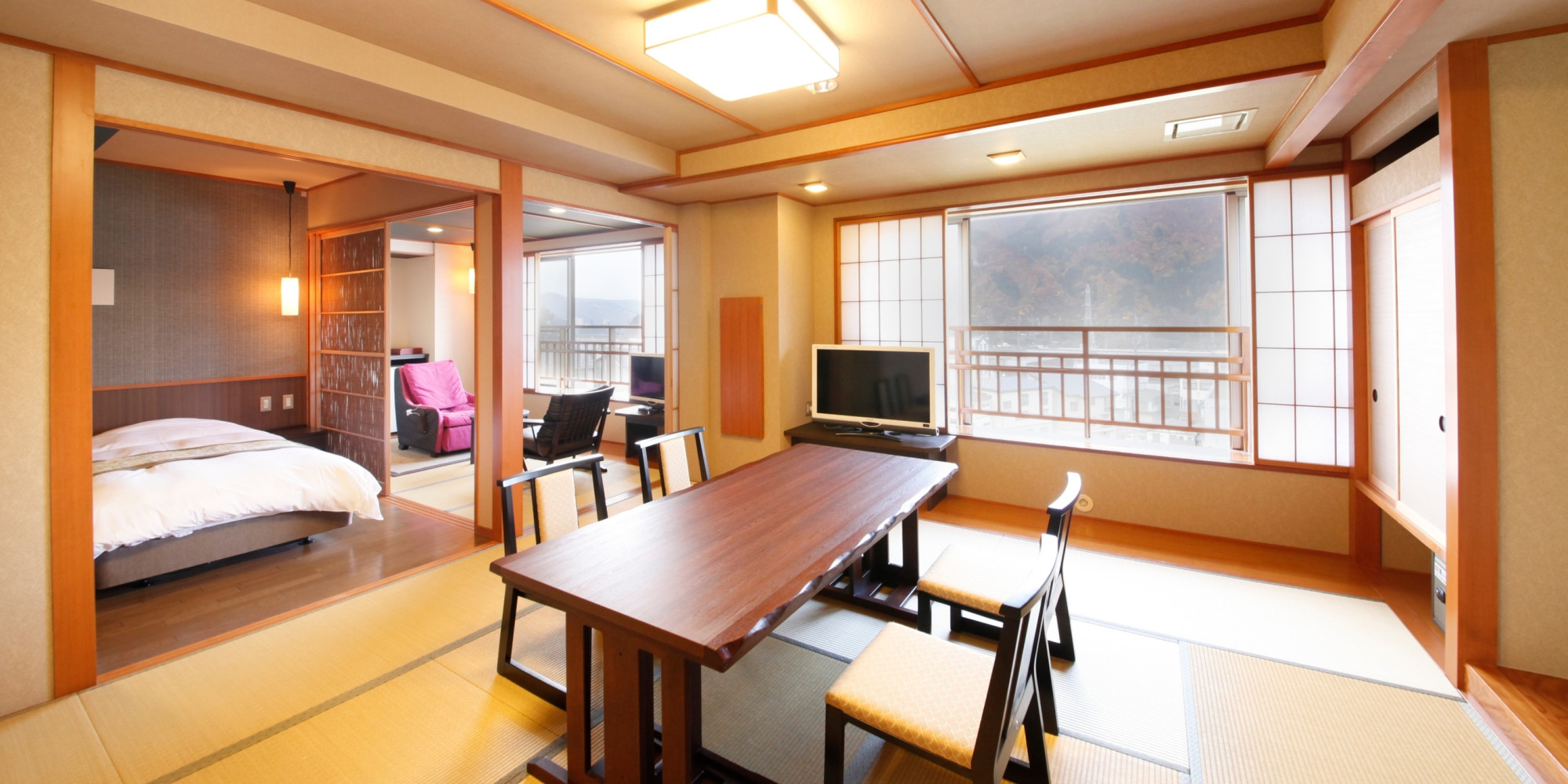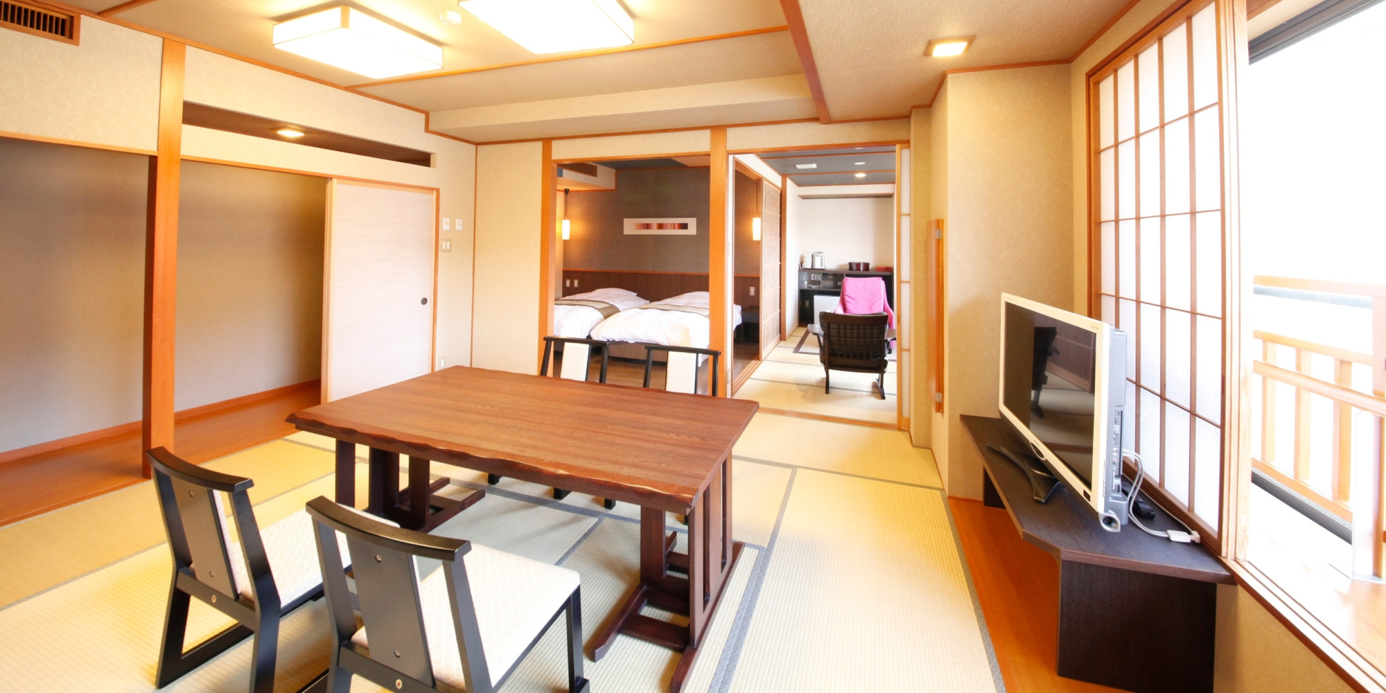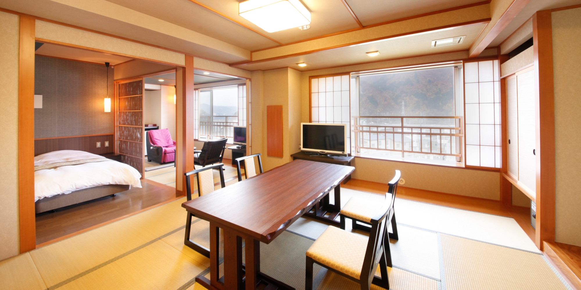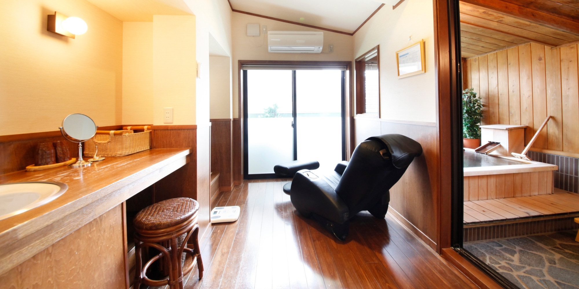 定員2~6名様のメインルーム和室15畳間 / ツインベッドルーム / 源泉掛け流し展望風呂 / マッサージチェアを併設した特別室です。